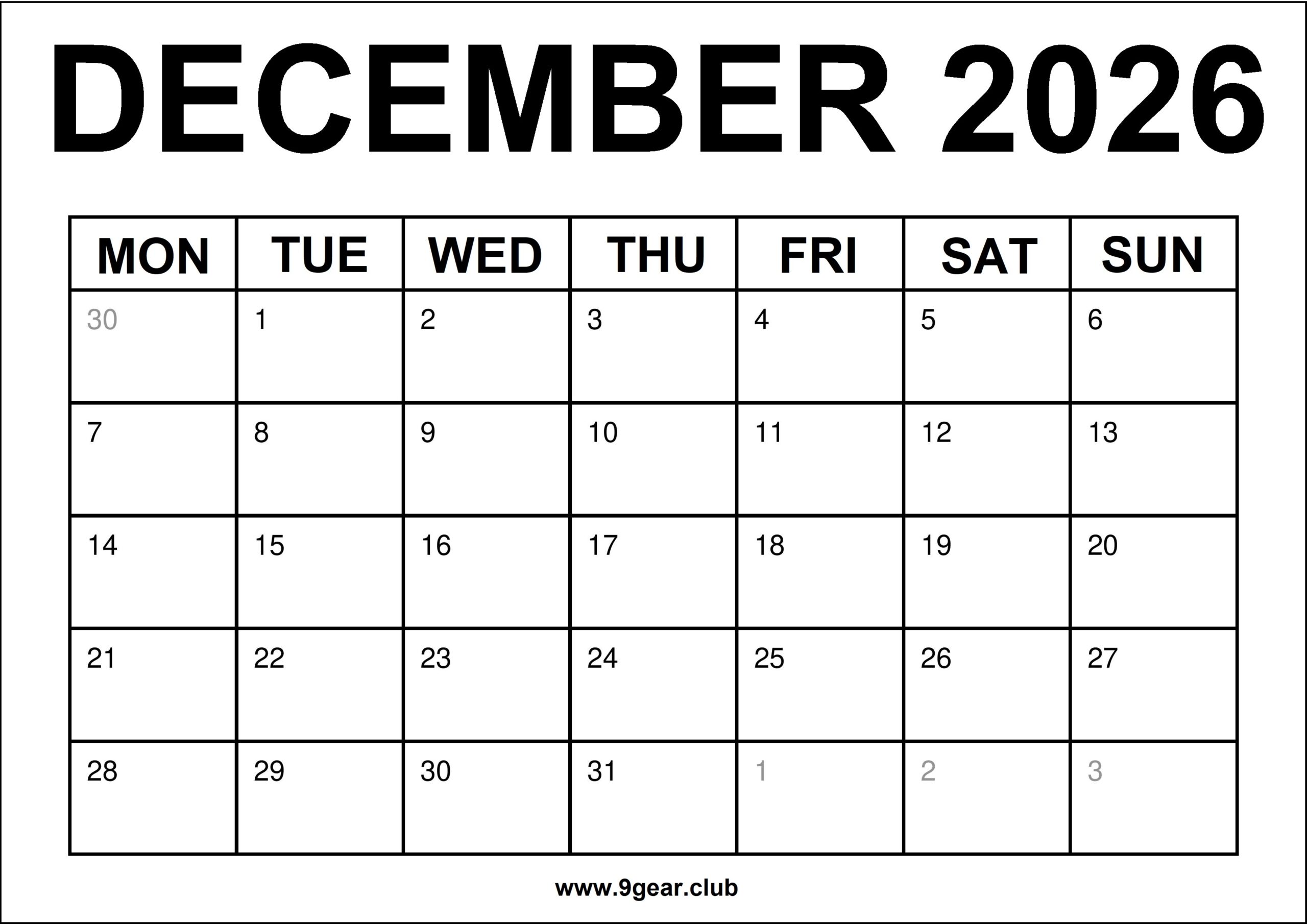 2026 December Monday Start Calendar Free Printable Monday start week calendar Landscape Monthly. Monthly 2026 December Calendar – Month begins on Monday, ends on Sunday. – December 2026 Monthly calendar Starting on Monday. – A4 size landscape Horizontal Office Wall Calendar December. – Click on image to download HD image JPG