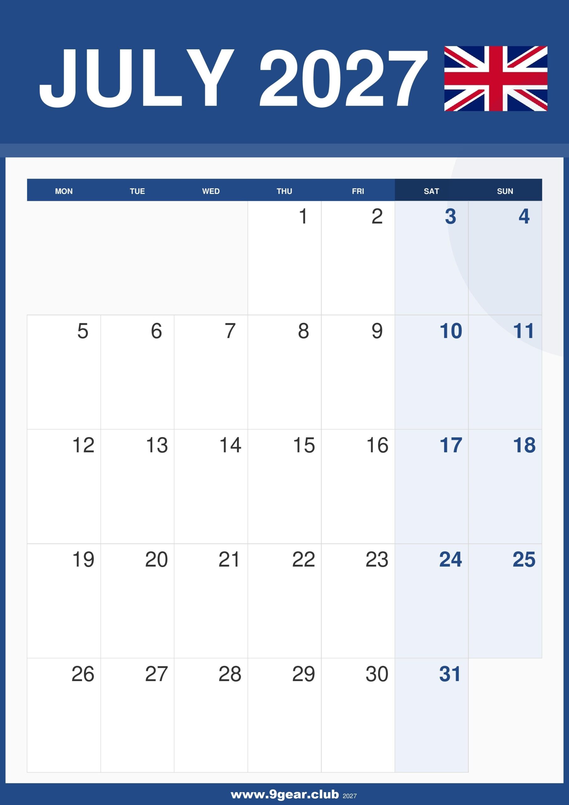 July 2027 Calendar UK with Bank Holidays Download Free A4 paper size UK Bank Holidays 2027 2027 July Calendar UK – Vertical A4 size print ready July 2027 calendar UK printable UK Calendar with bank holidays 2027