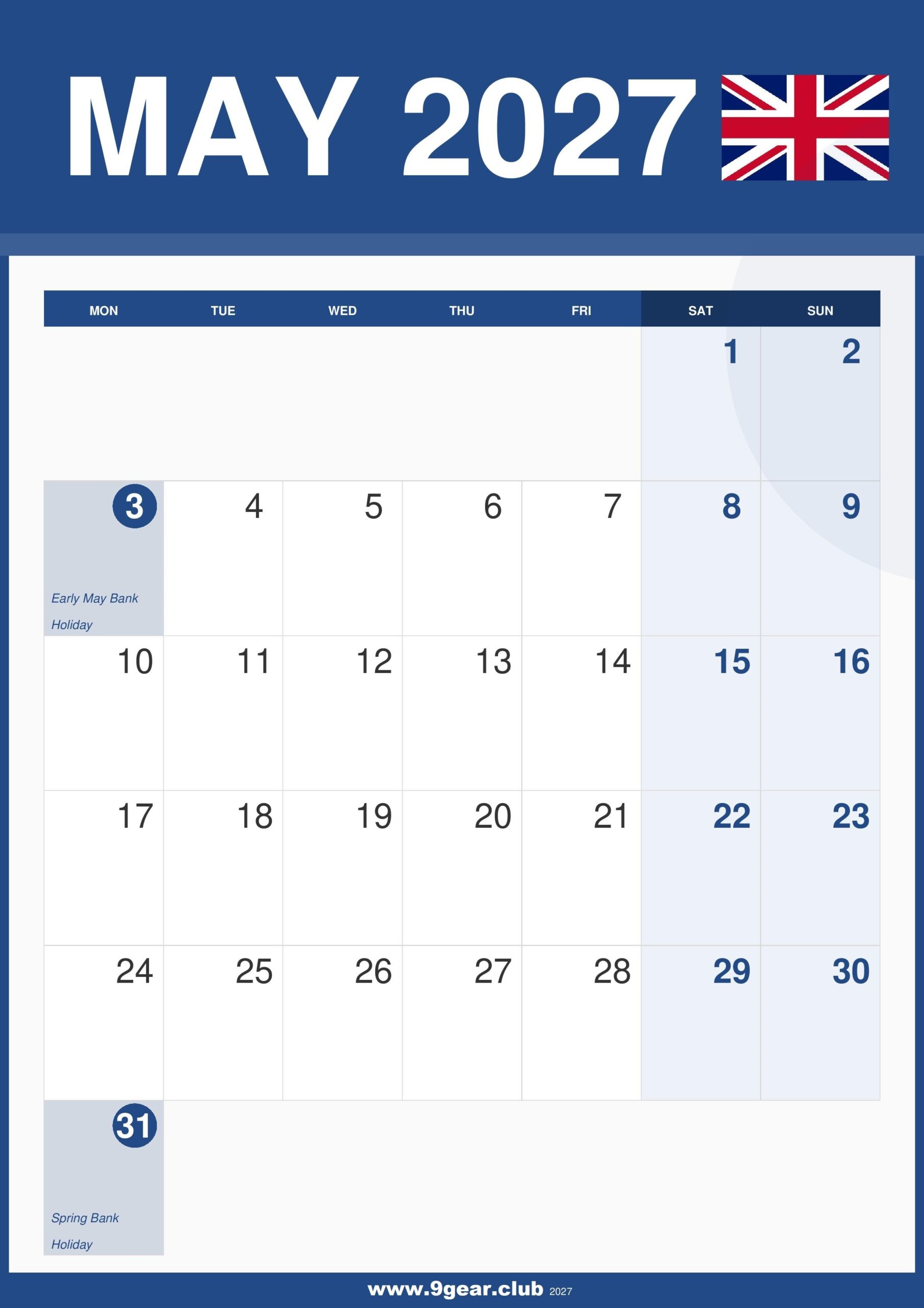 May 2027 Calendar UK with Bank Holidays Download Free A4 JPG 3rd May 2027, Monday – Early May Bank Holiday. 31st May 2027, Monday – Spring Bank Holiday 2027 May Calendar UK – Vertical A4 Planner Layout May 2027 calendar UK printable UK Calendar with bank holidays 2027