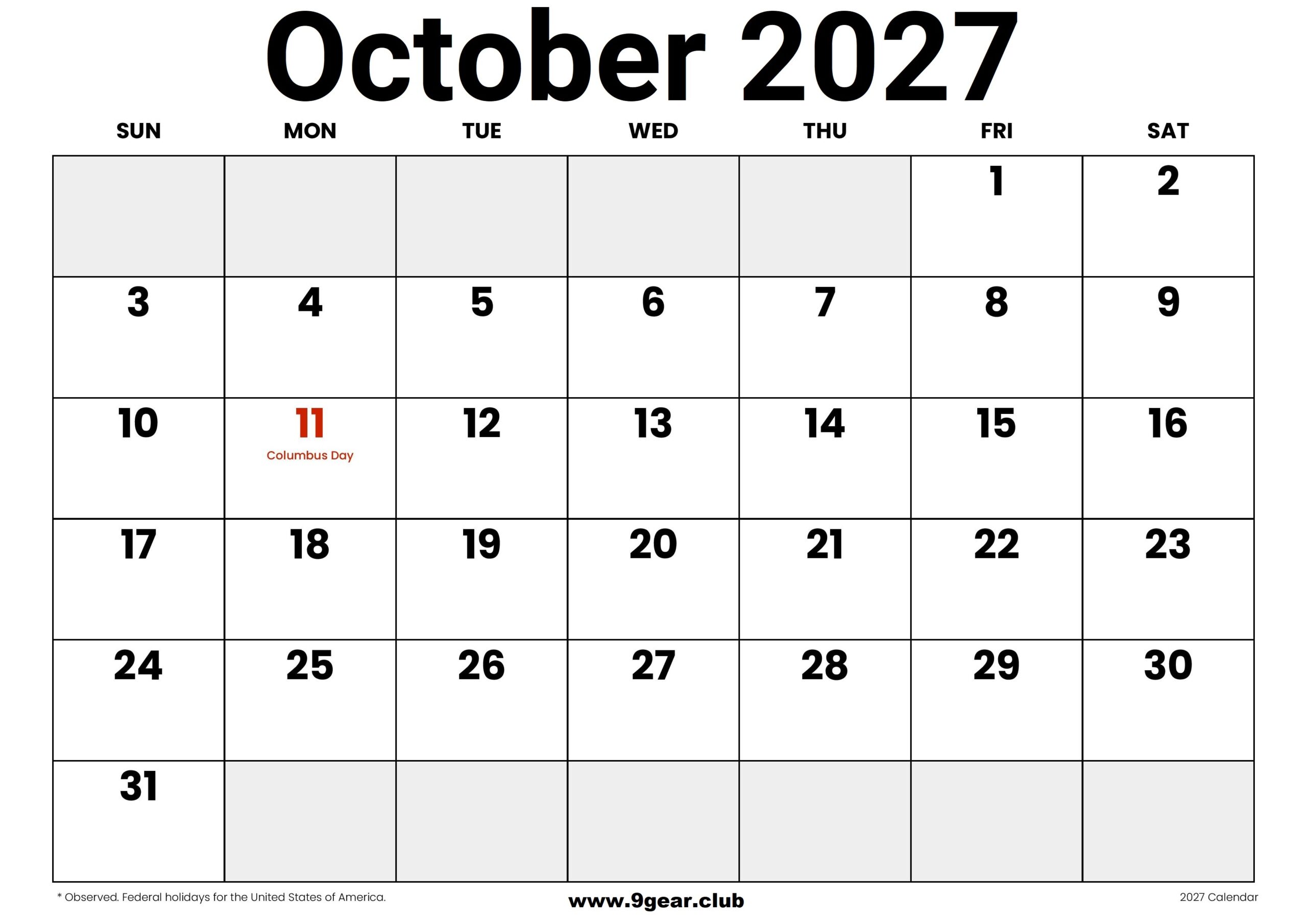 2027 October USA Calendar with holidays. A4 paper Size, October 2027 Printable Calendar, Free Download. Monday, October 11, 2027 – Columbus Day. Free October 2027 Calendar Printable: USA Holidays Simple calendar, large print, calendar with boxes, Horizontal.. Click Here to download calendar #October2027 #PrintableCalendar #Planner #FreePrintables #USAHolidays #2027Calendar