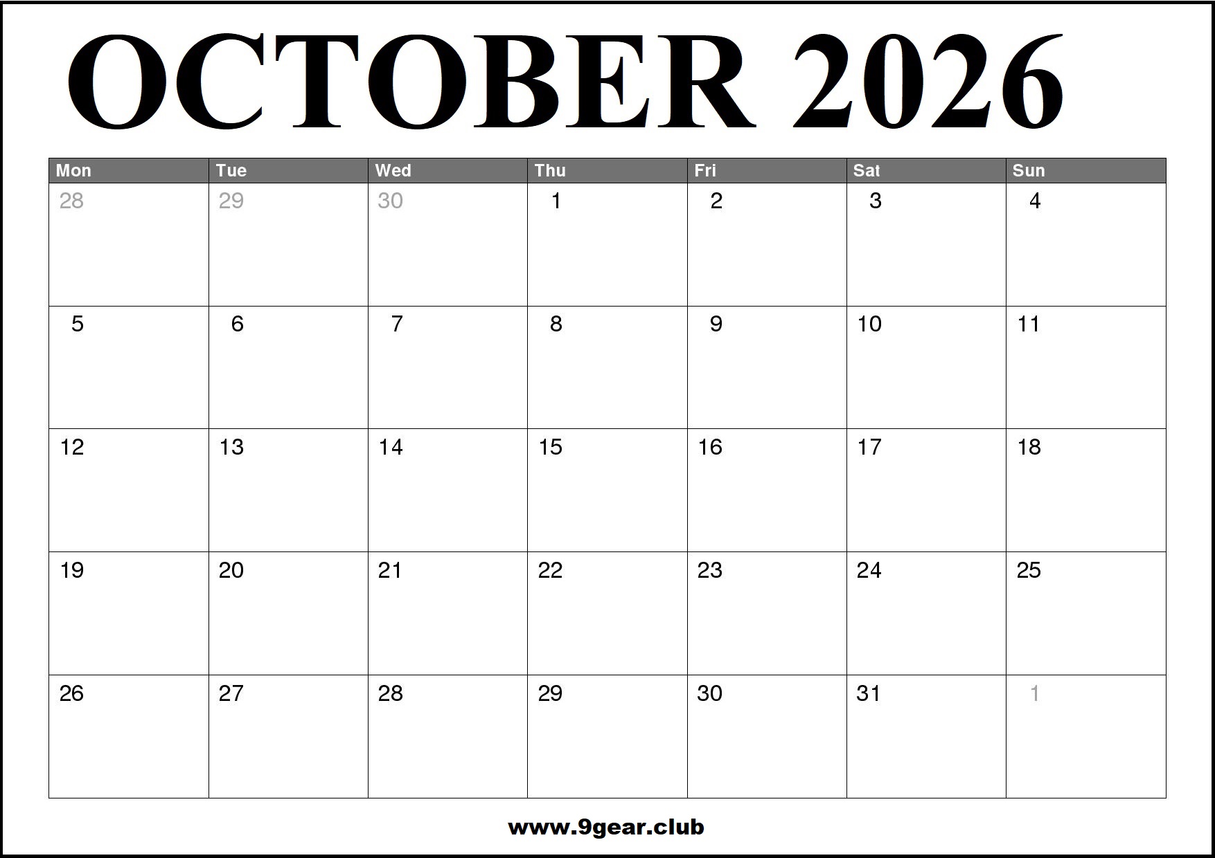 October 2026 Monthly Calendar UK – Horizontal A4 Size