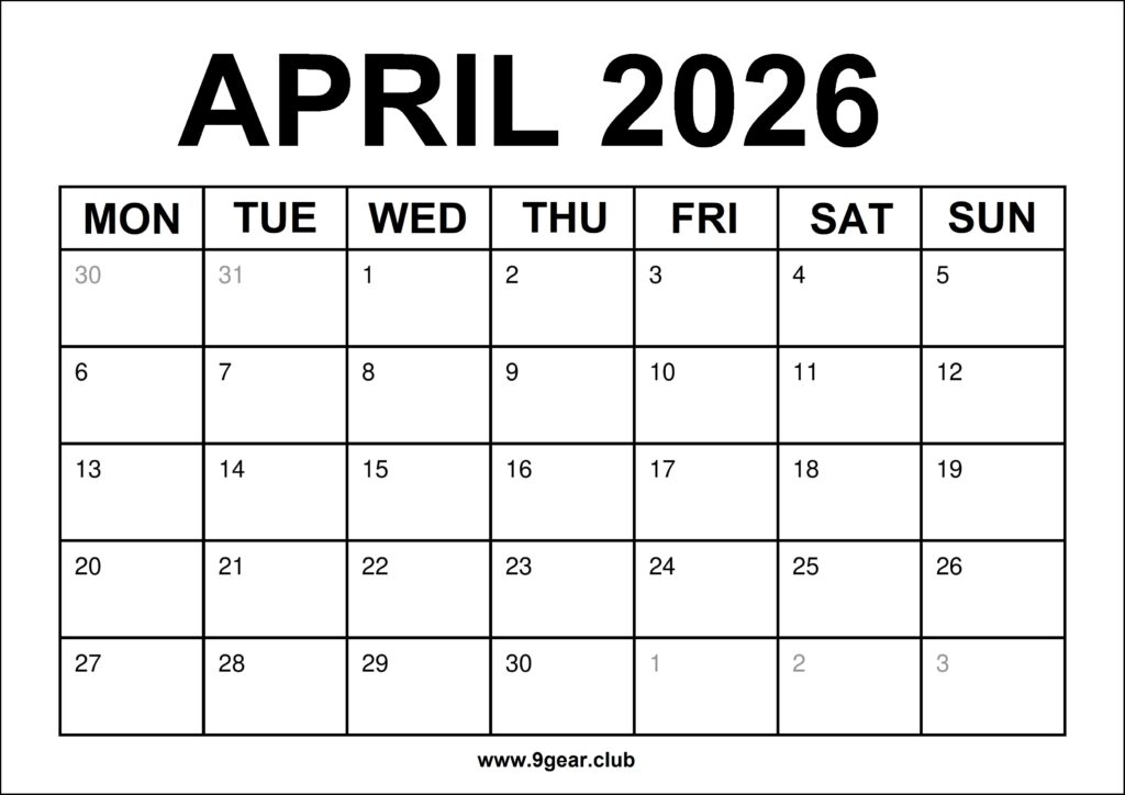 Monthly 2026 April Calendar – Month Starts with Monday, ends with Sunday.