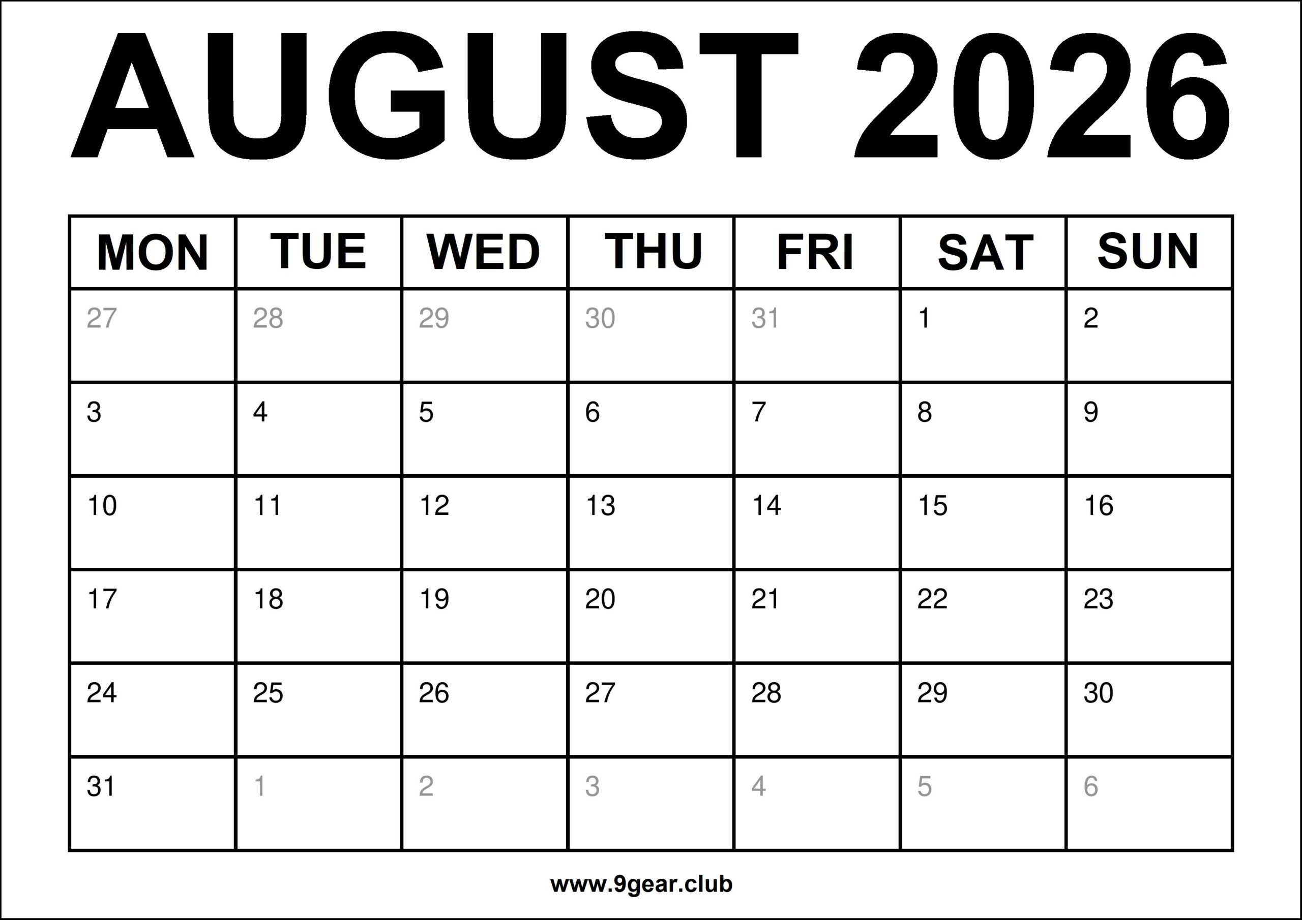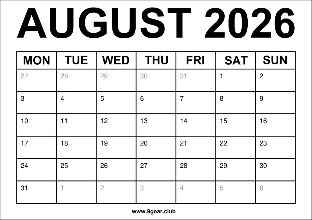 – August 2026 Monthly calendar Starting on Monday.