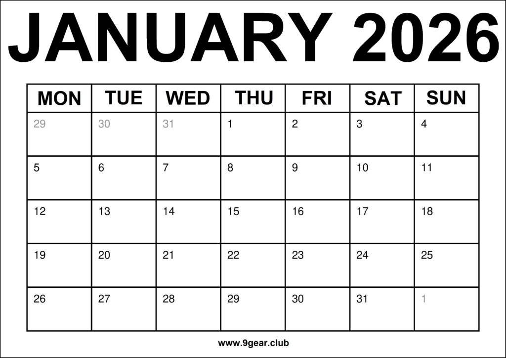 Monthly 2026 Calendar – Month Starts with Monday, ends with Sunday.