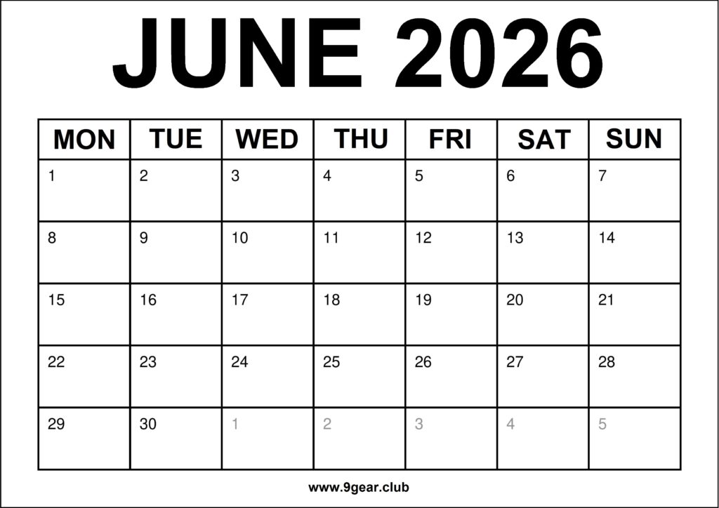Monthly 2026 June Calendar – Month Starts with Monday, ends with Sunday.