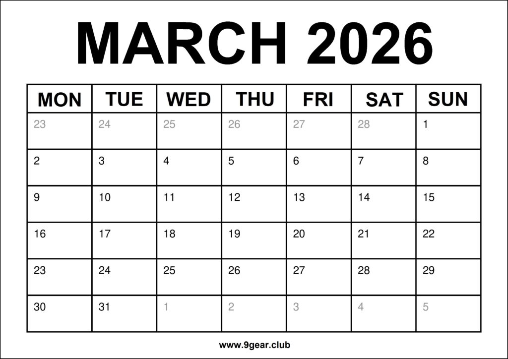 2026 March Free Printable Monday Start Calendar