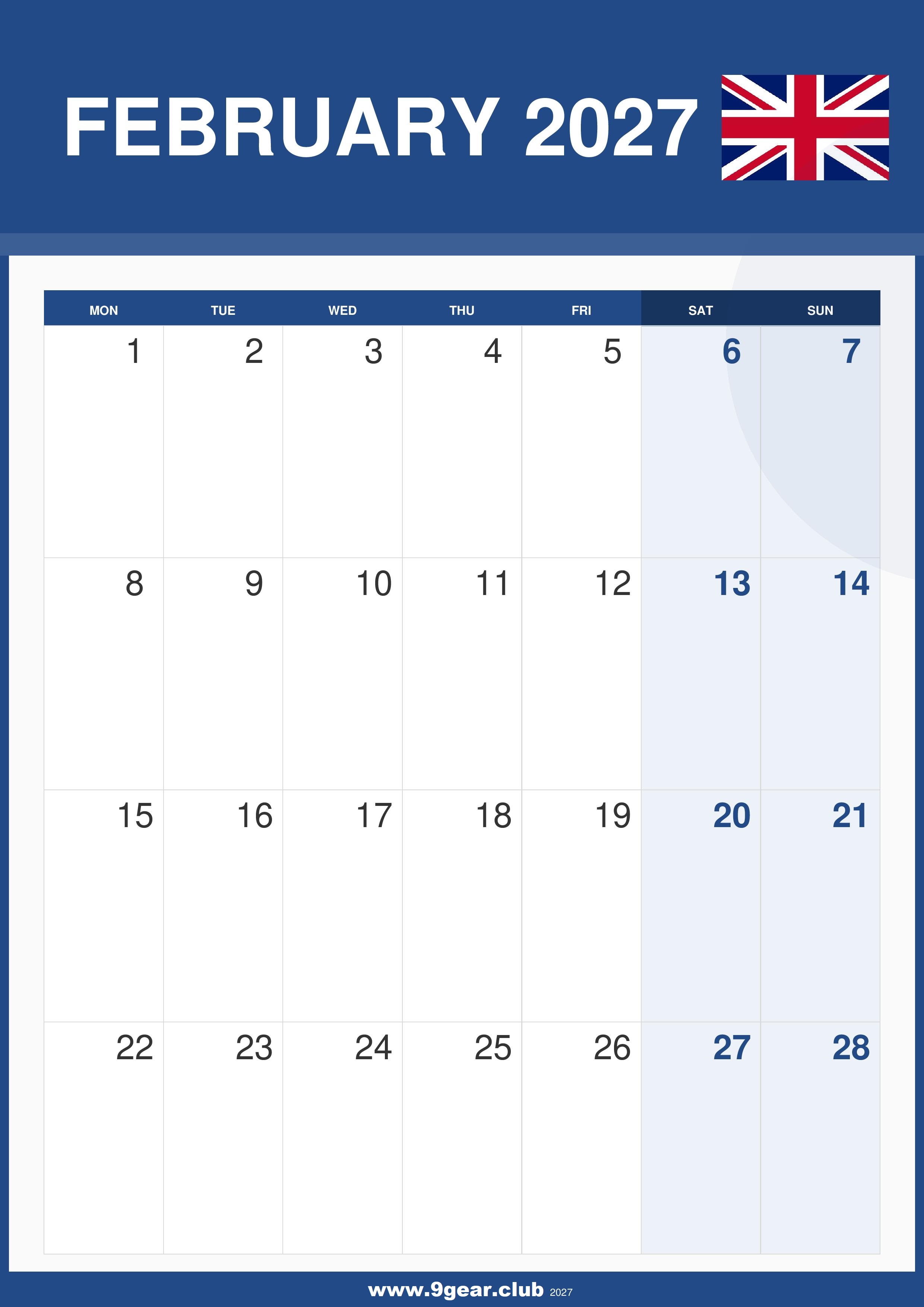 February 2027 calendar UK printable