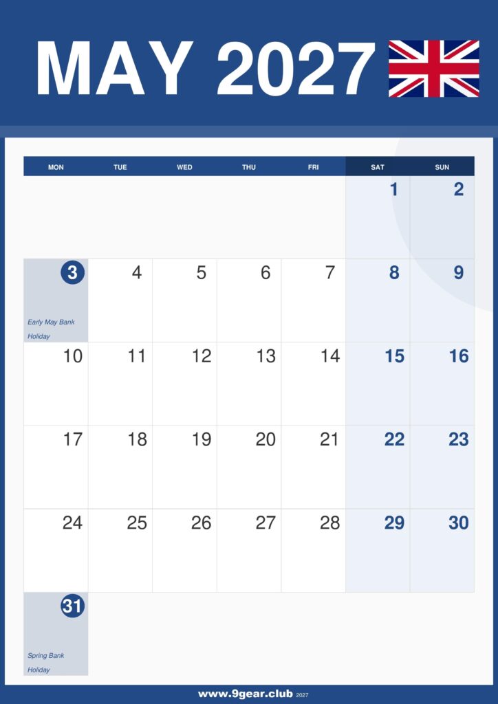 2027 May Calendar UK – Vertical A4 Planner Layout