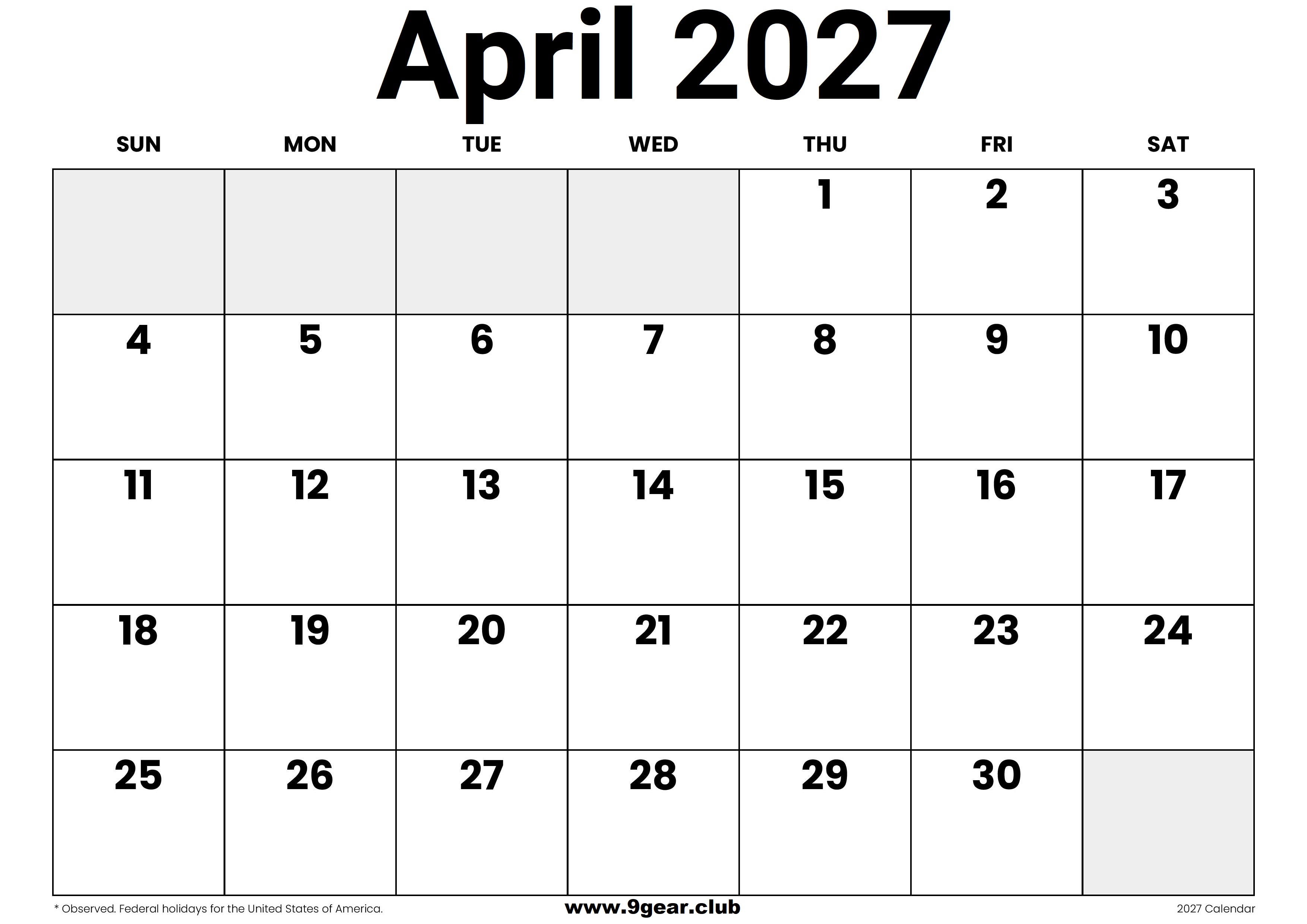 2027 April USA Calendar with Federal holidays.