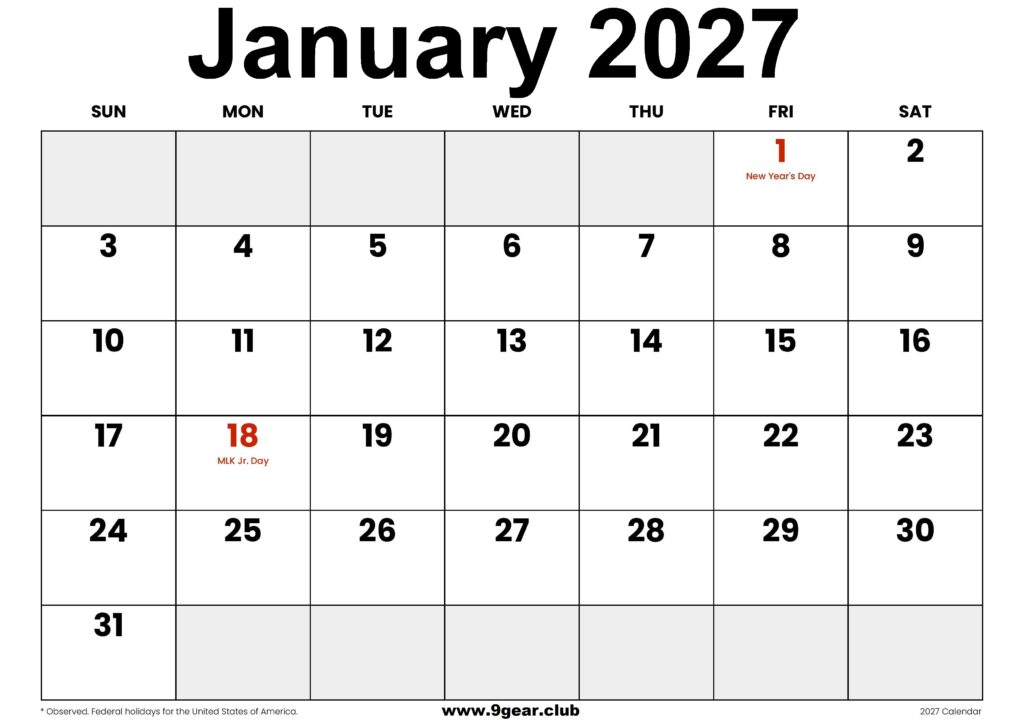 2027 January USA Calendar with Federal holidays.