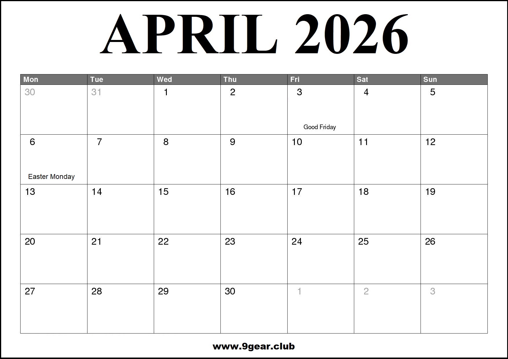 2026 April United Kingdom 🇬🇧 Calendar with Holidays April 2026 Monthly Horizontal Planner – UK Free Download Printable UK Calendar Monday Start 3rd April 2026 Friday – Good Friday 6th April Monday – Easter Monday 2026 April Monday Week Start, Calendar UK Monday Start Monthly Calendar, UK, Horizontal