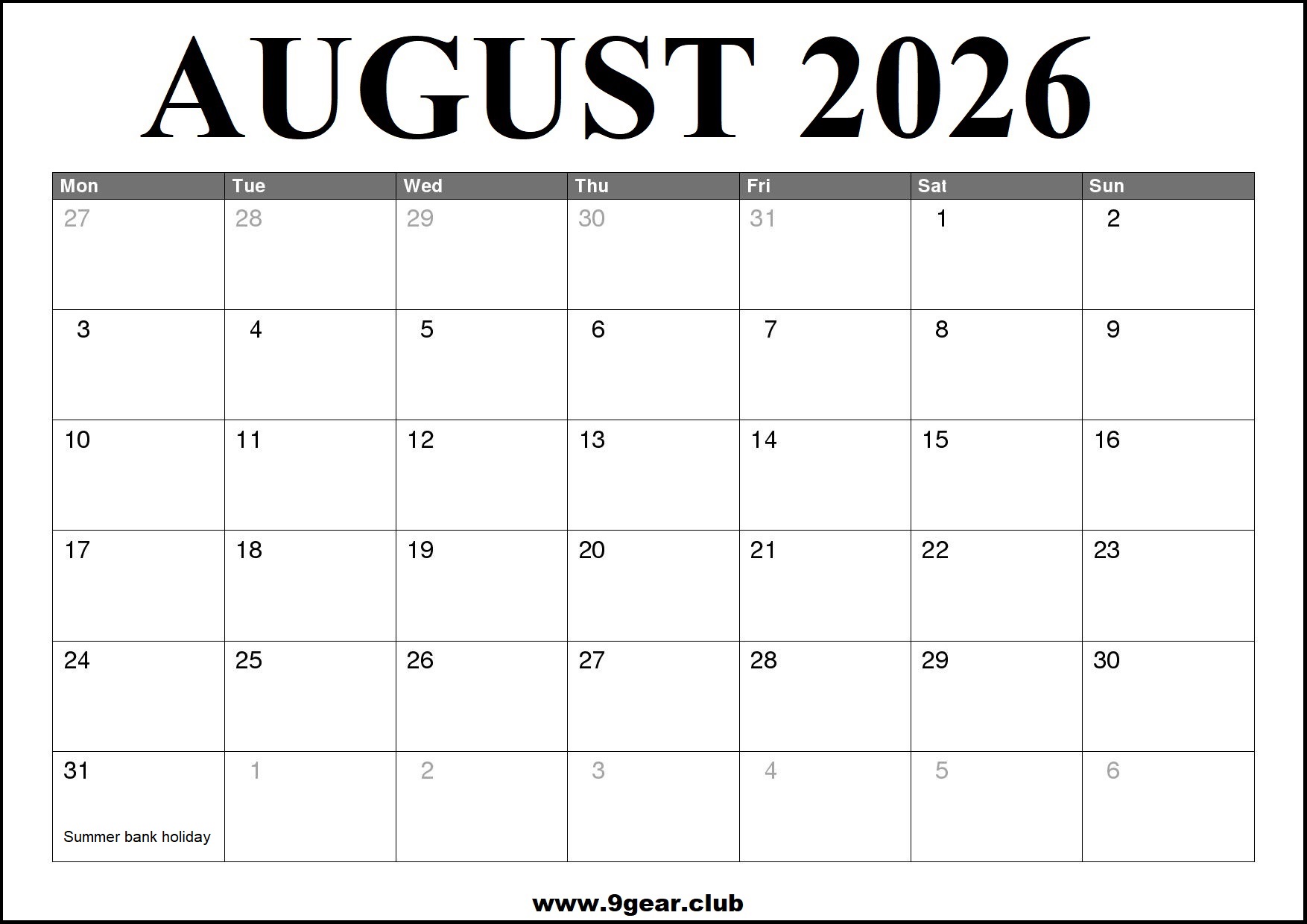 2026 August United Kingdom 🇬🇧 Calendar with Bank Holidays August 2026 Monthly Calendar UK – Horizontal A4 Size Monday Start, Free Download Printable UK Calendar 31st August 2026, Monday – Summer bank holiday 2026 August Monday Week Start, UK Calendar Monday Start Monthly Calendar, Horizontal, UK.