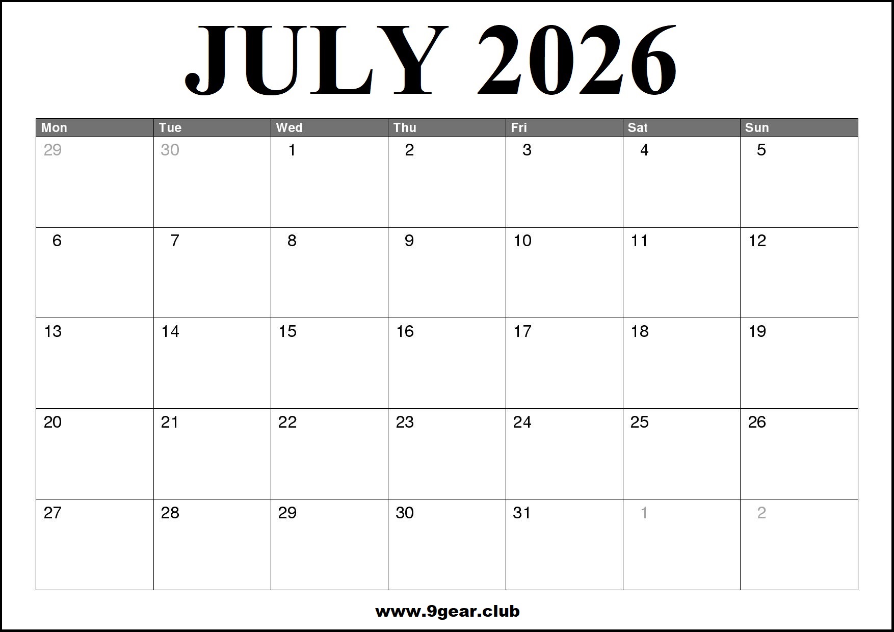 July 2026 Monthly Calendar UK – Horizontal A4 Size 2026 July United Kingdom 🇬🇧 Calendar with Holidays Monday Start, Free Download Printable UK Calendar 2026 July Monday Week Start, UK Calendar Monday Start Monthly Calendar, Horizontal, UK.